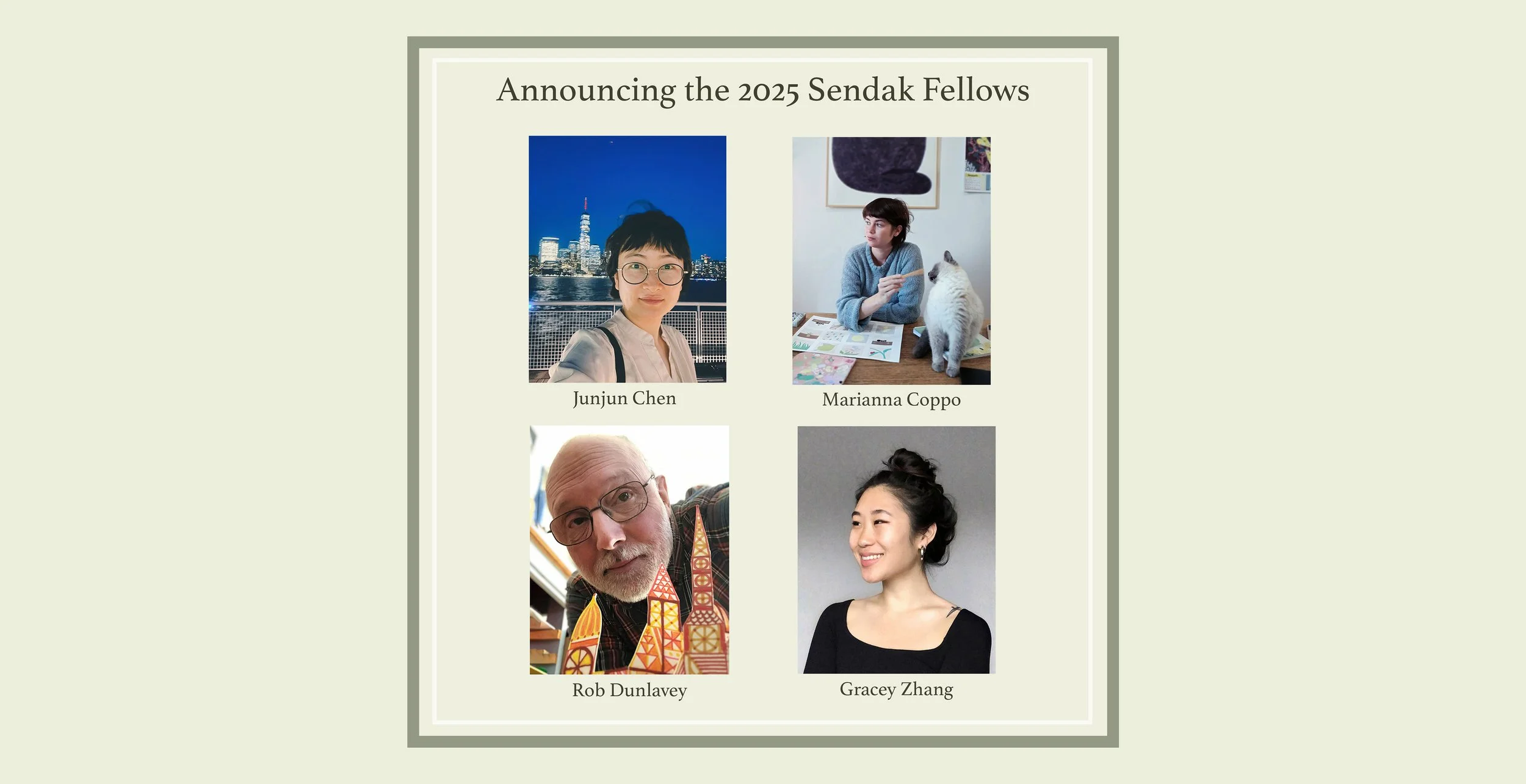 Ridgefield, CT (March 5, 2025) – The Maurice Sendak Foundation has named four illustrators as 2025 Sendak Fellows: Junjun Chen, Marianna Coppo, Rob Dunlavey, and Gracey Zhang.